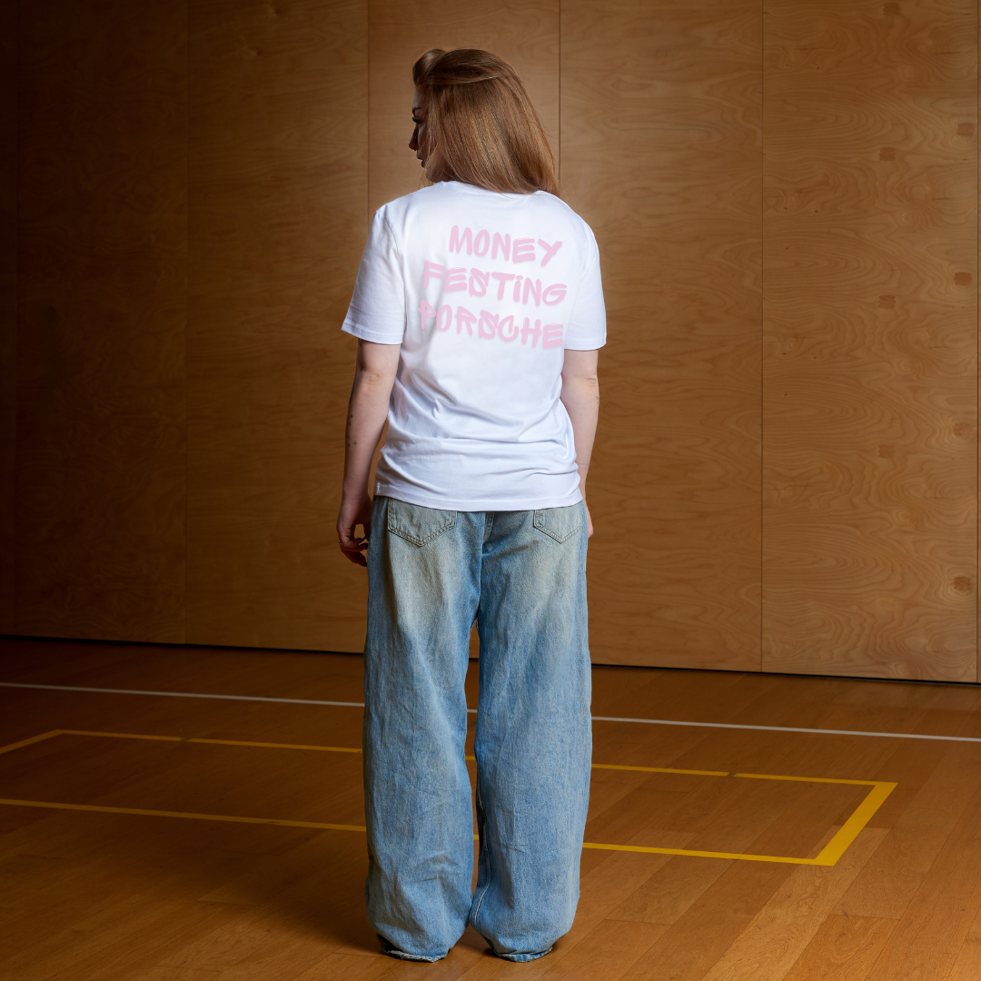 graffiti nápisem „MONEY FESTING PORSCHE“ na zádech křičí, že víš, co chceš.